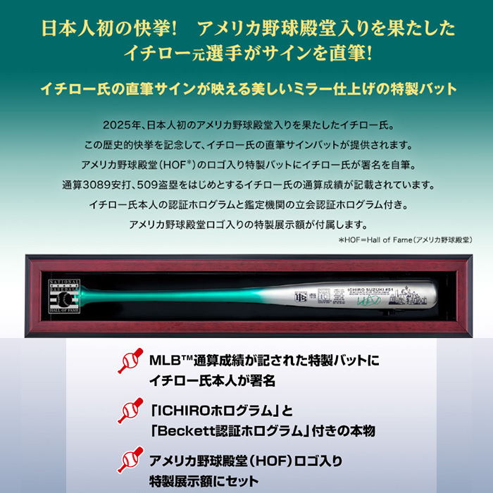 日本人初となるこの快挙を記念して、イチロー氏の直筆サインバットが提供されます。