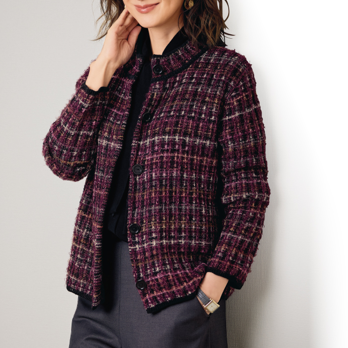 ウール混ミックス格子柄ニットジャケット